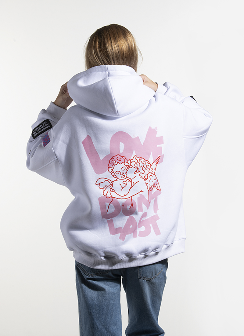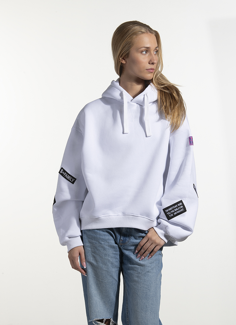 Oversized hoodie in white with a back print and embroidered sleeve details.