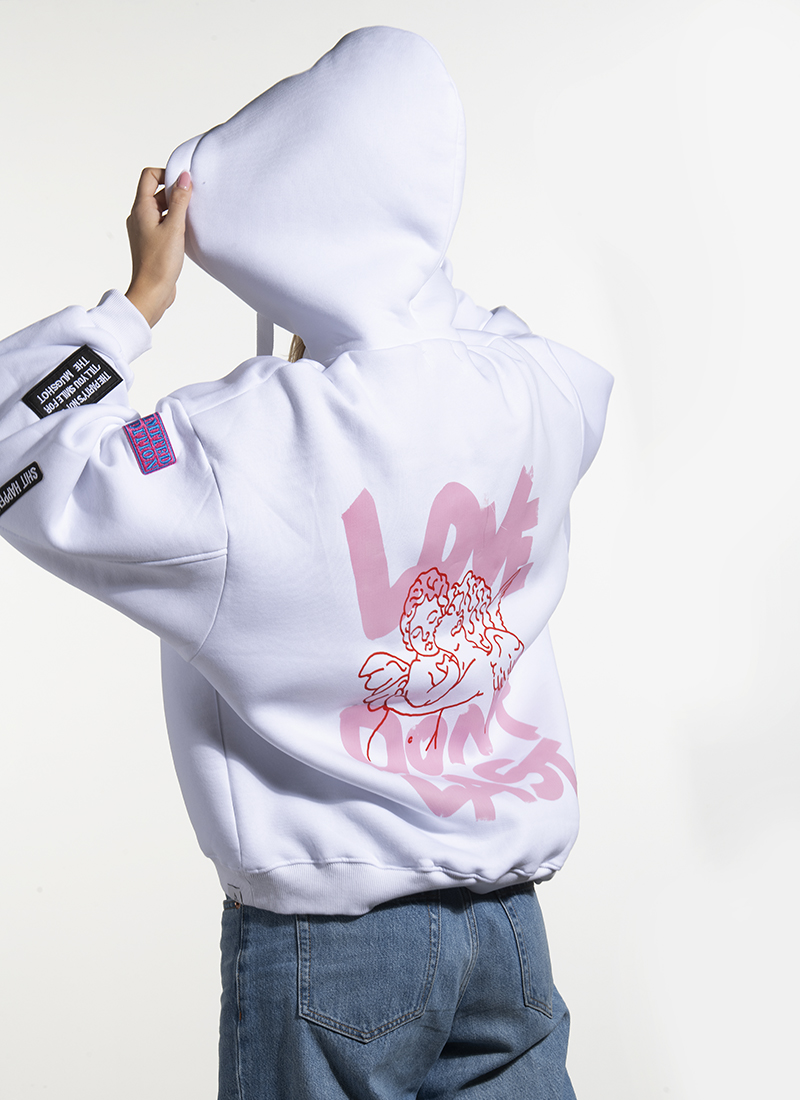 In white, featuring a bold back print and embroidered sleeve details, it adds a unique edge to your casual looks. Made from a cotton-polyester blend, it combines softness, warmth, and long-lasting wear.