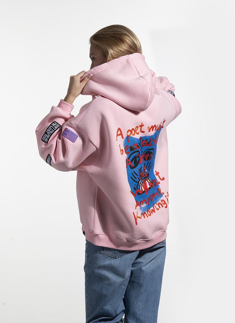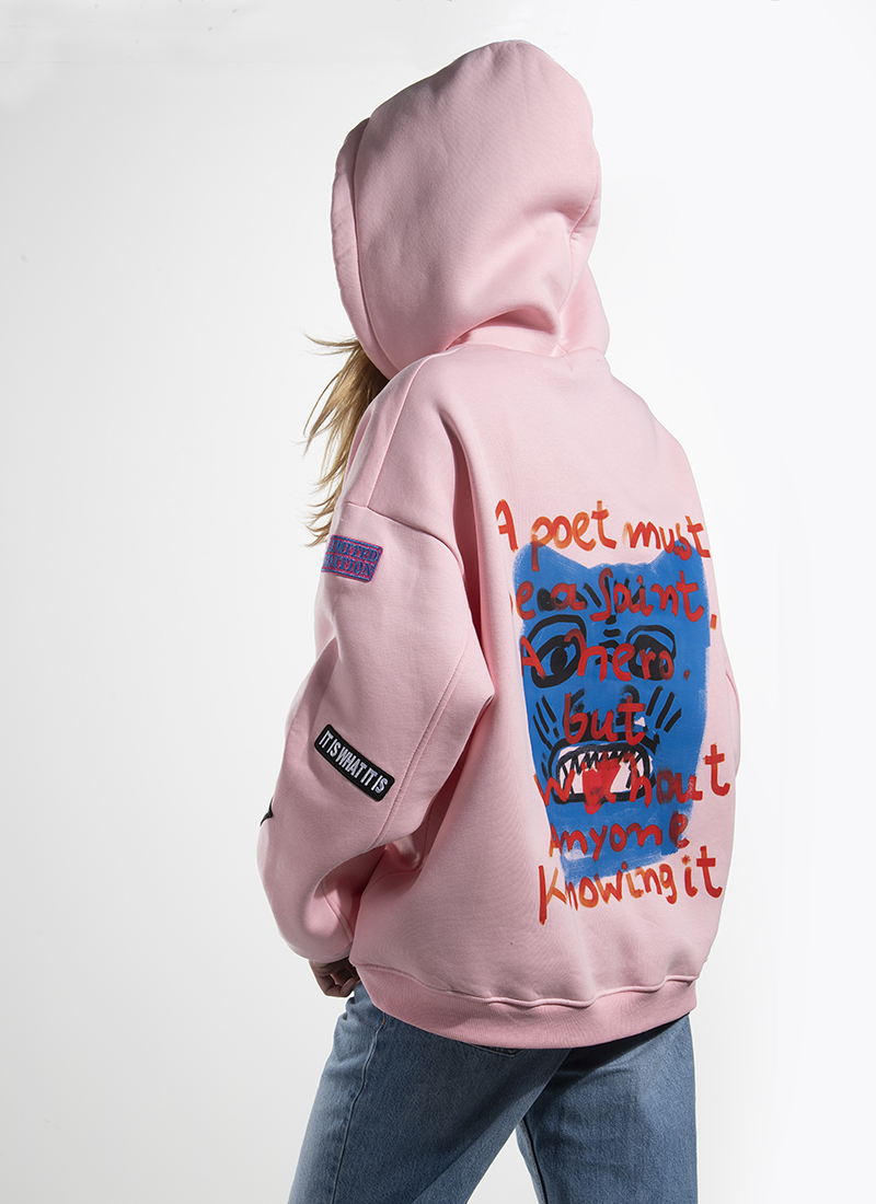Oversized hoodie in soft pink with a back print and embroidered sleeve details.