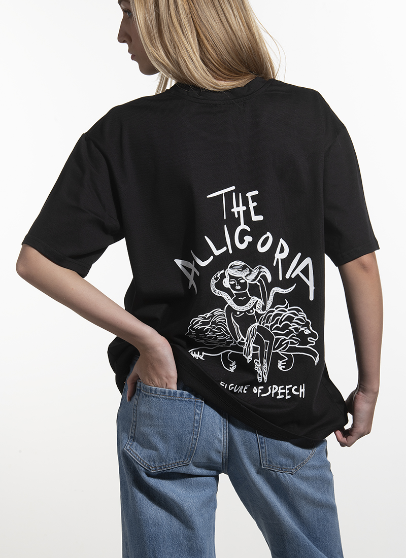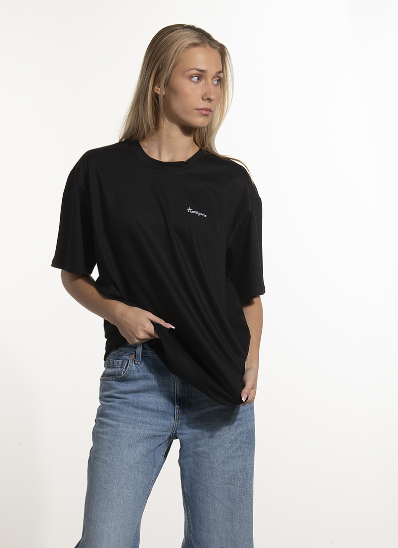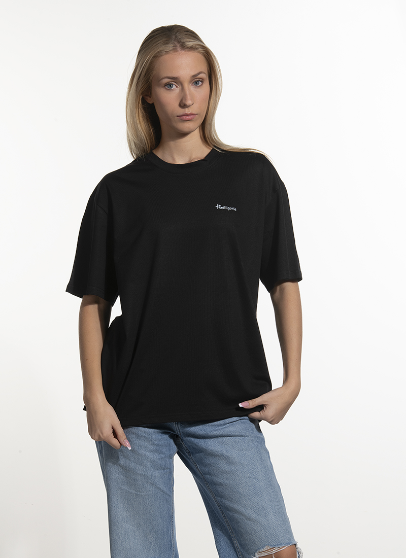 Oversized black T-shirt with print, comfortable and stylish with soft texture, perfect for casual or urban chic looks.