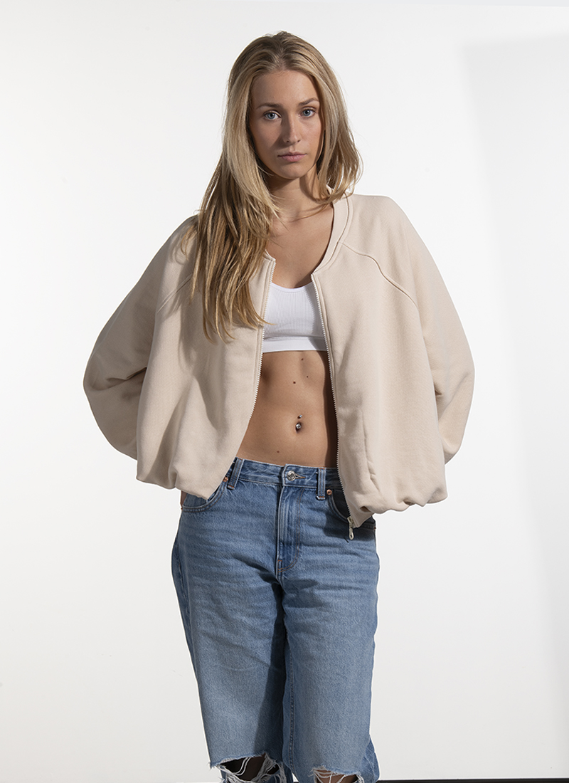 Ecru Bomber made from 100% cotton with an organic cotton lining, featuring an embroidered “The Alligoria” logo on the back.