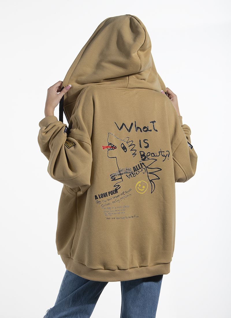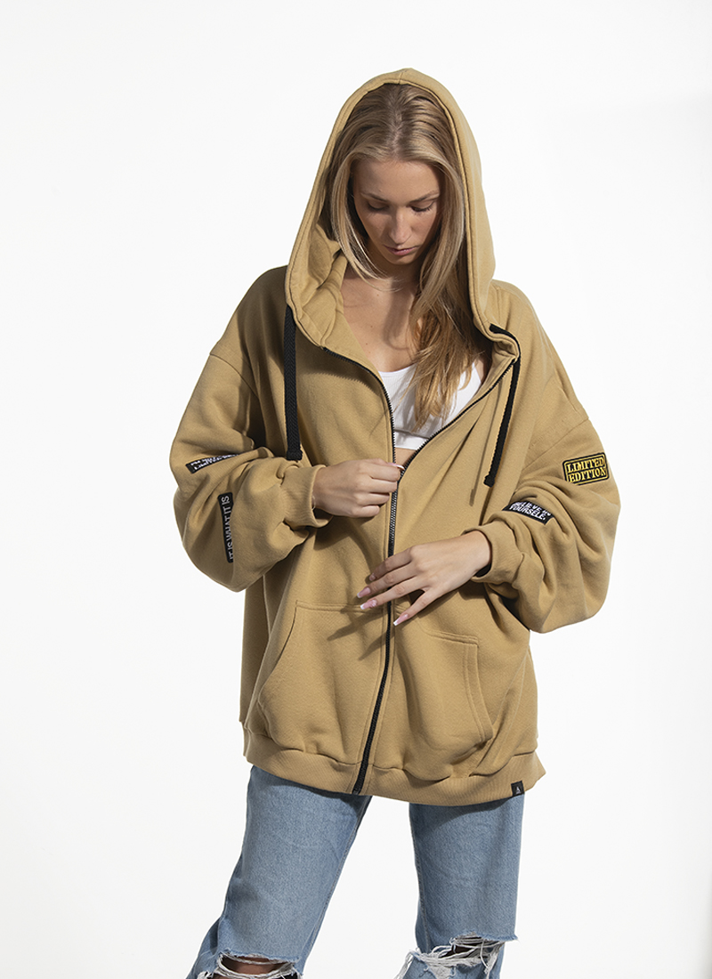 Oversized Full zip hoodie in tan color, made from 100% cotton, with front zipper, pockets, and embroidered sleeve details.